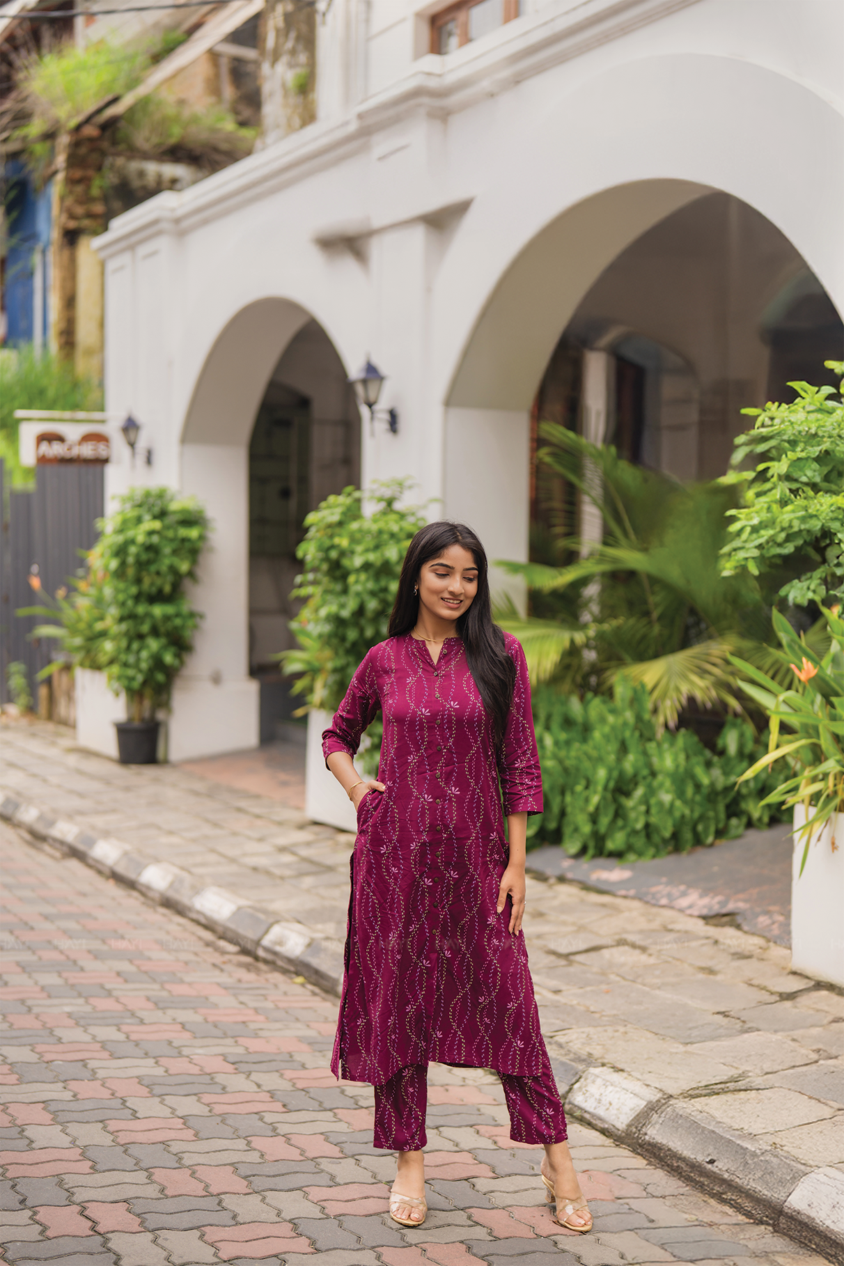 • Design: Stylish two-piece co-ords set featuring kurta and straight-fit bottoms