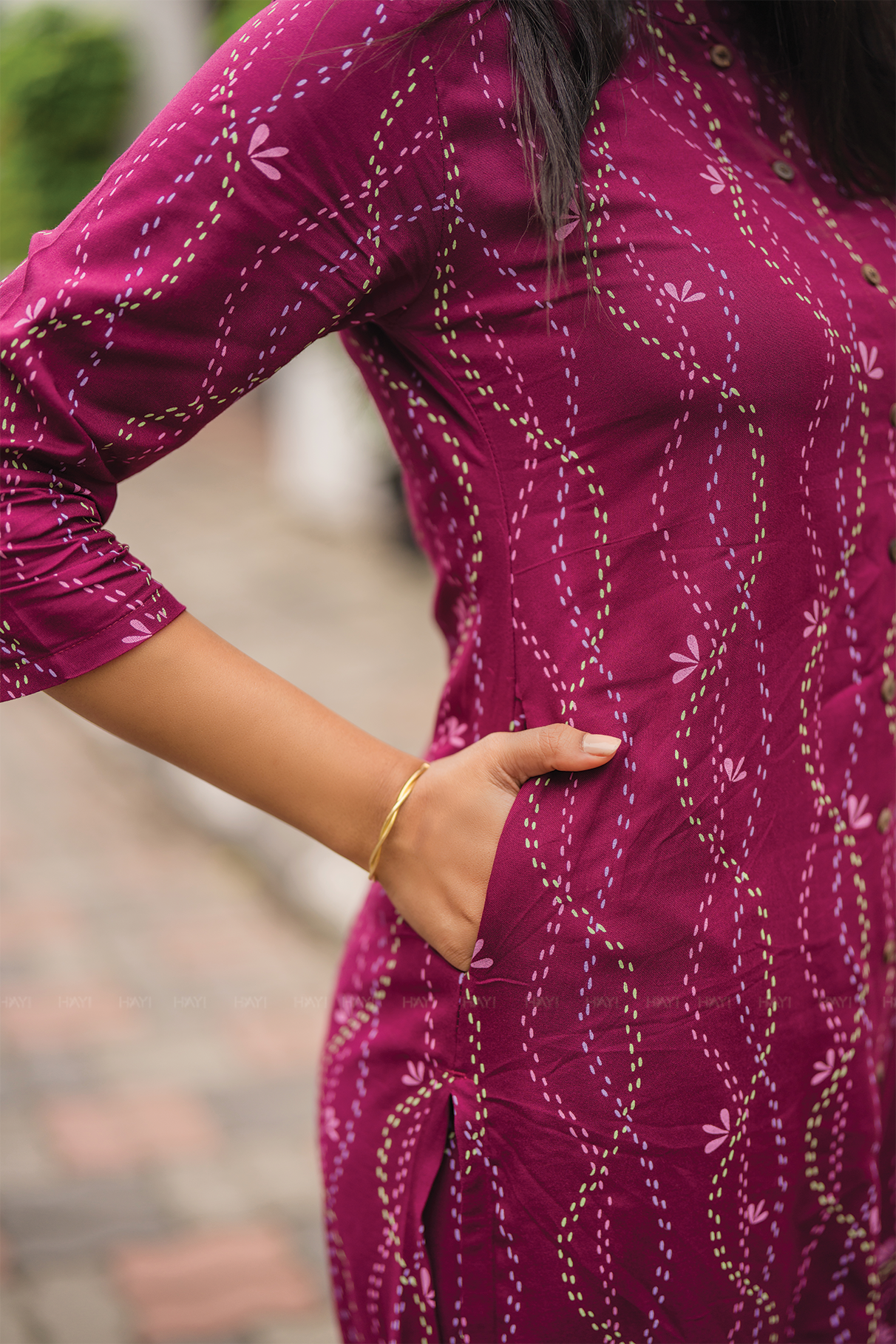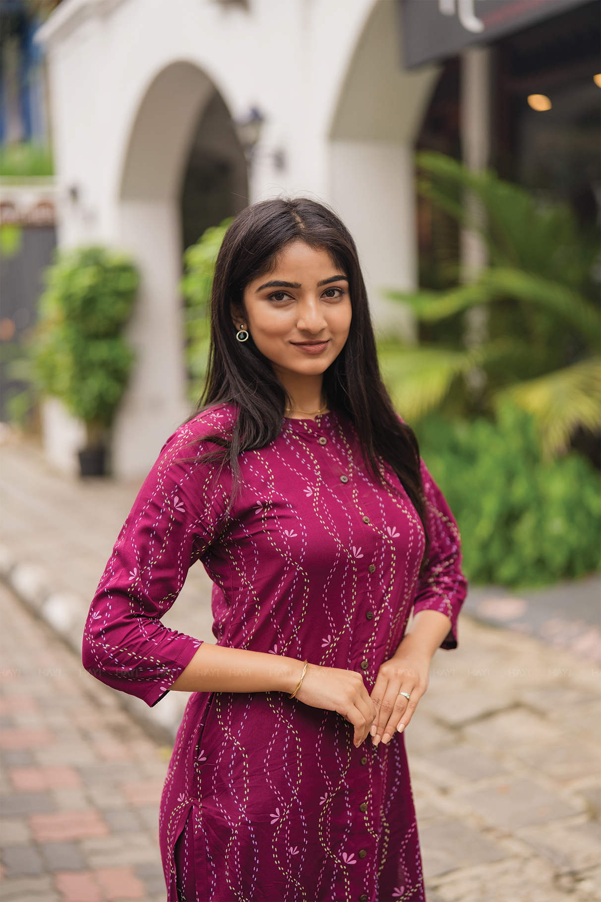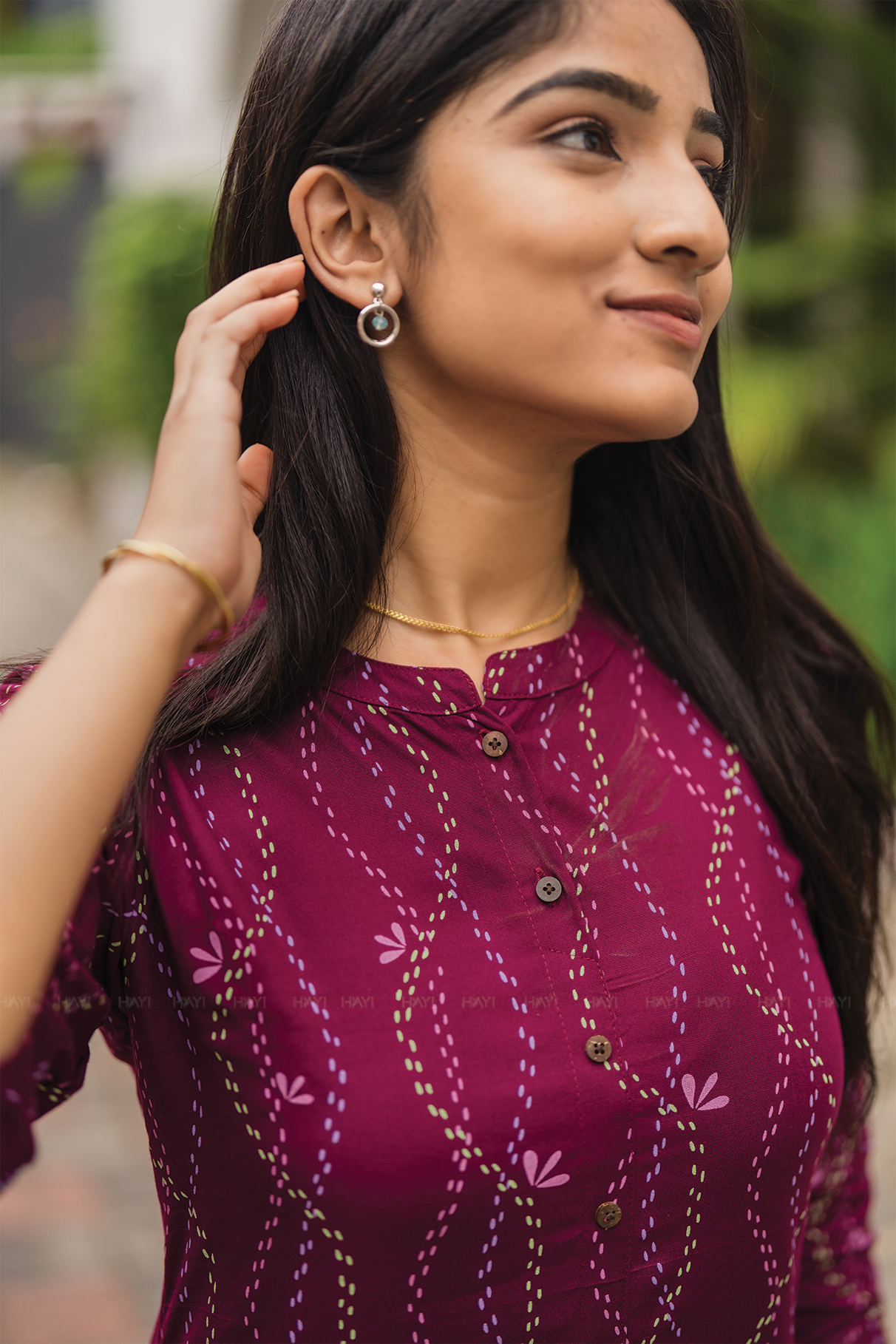 Make an elegant statement with the Euphoric Oasis designed for a flowy feel. The deep wine base is enhanced with delicate vine-inspired prints, bringing a graceful touch to your festive and everyday wardrobe.