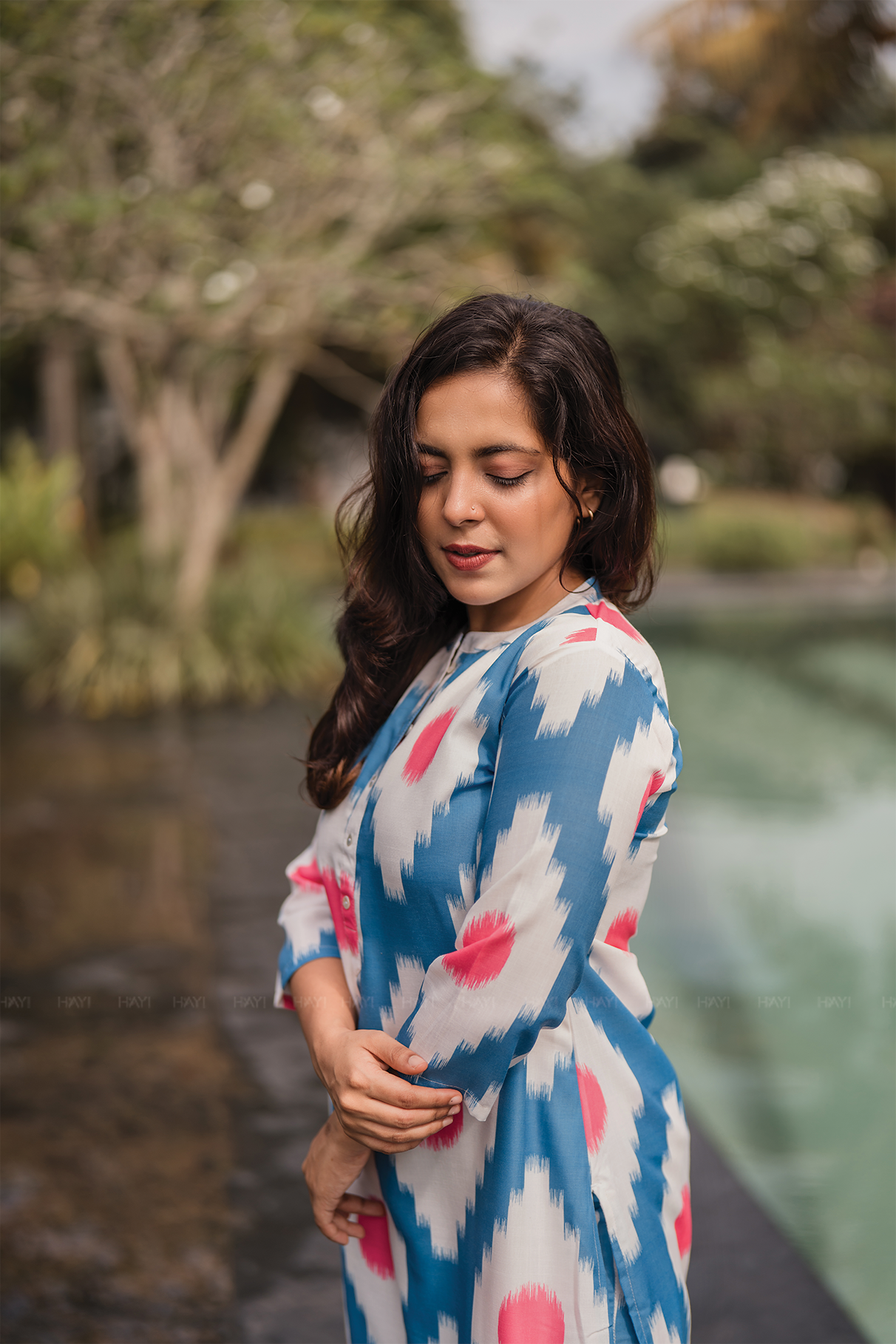 • Color: Half-white with blue and pink ikat prints