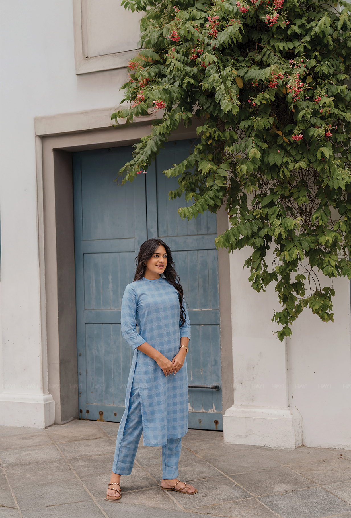Design: Straight-fit kurta paired with slim trousers in matching checks