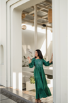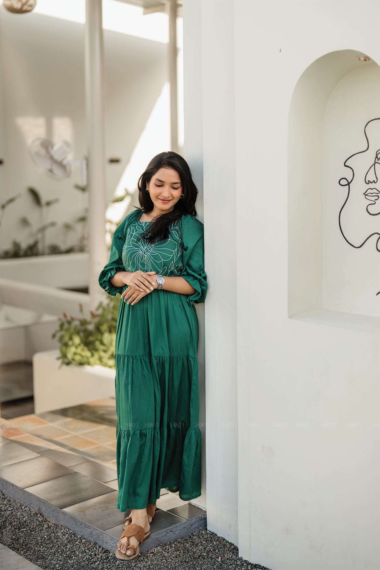 Step into elegance with this Meadow Bloom Green Maxi Dress, designed to make every occasion feel special. The deep green shade paired with delicate floral embroidery on the bodice adds a touch of sophistication. Perfect for festive gatherings, casual outings, or evening celebrations, this dress offers both comfort and timeless charm.