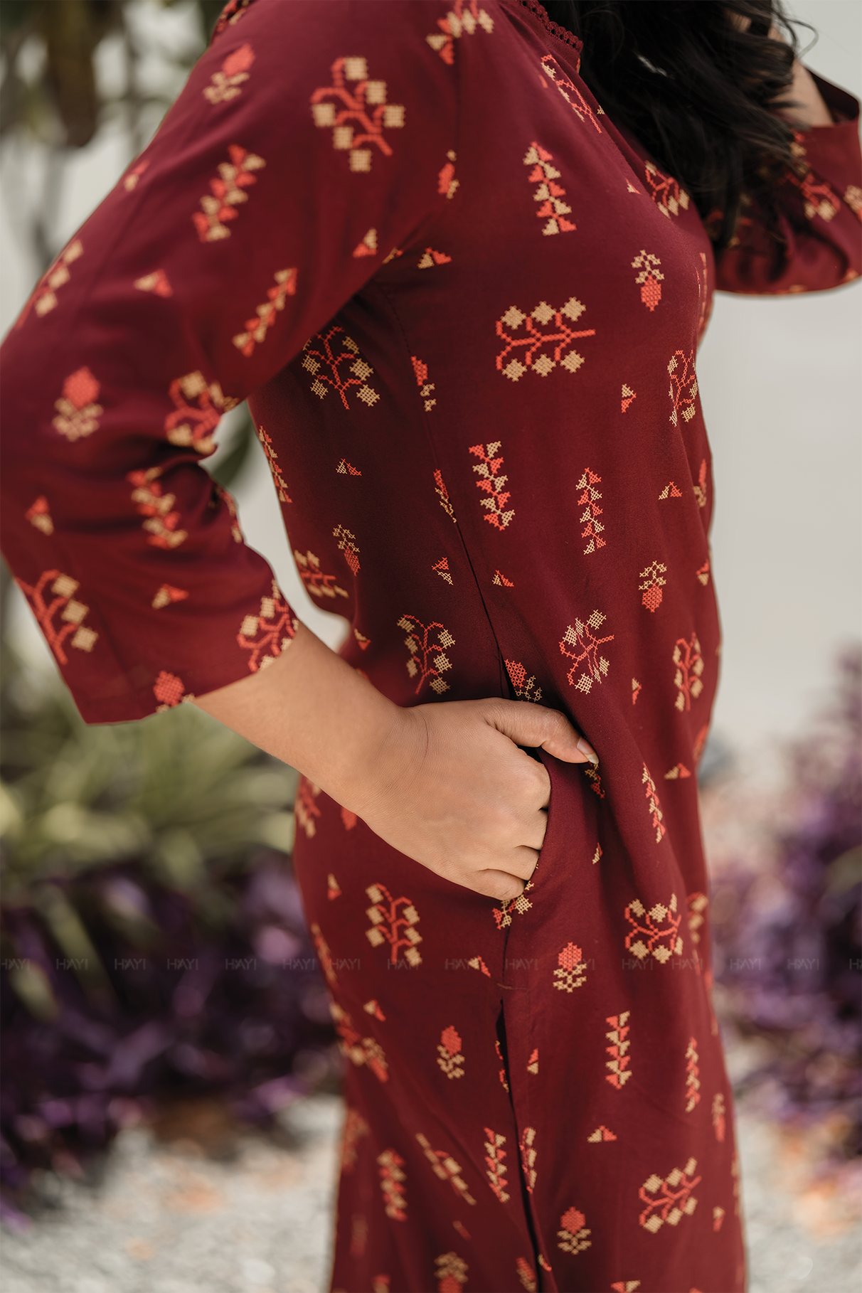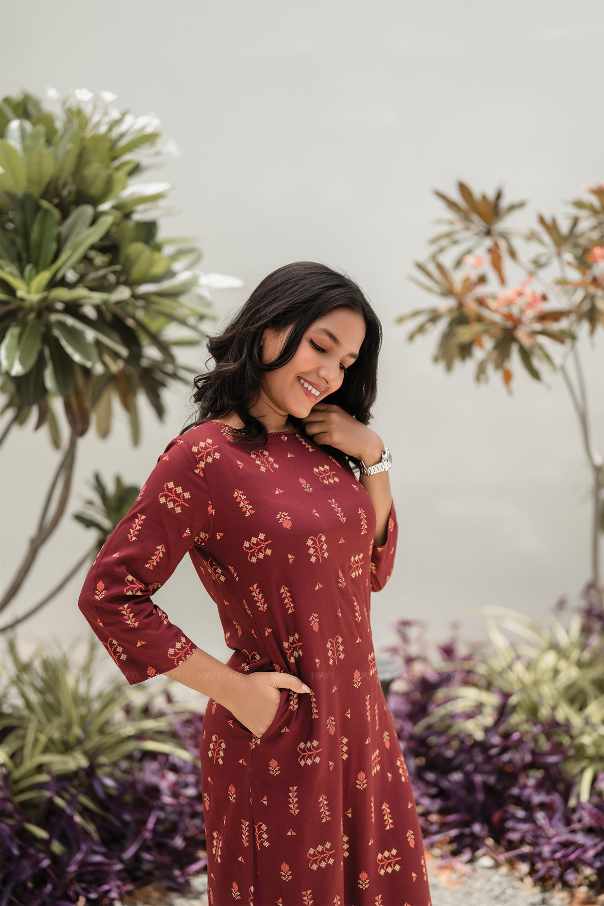 Elevate your ethnic wardrobe with this elegant brown floral print kurta – a chic blend of tradition and contemporary style.
