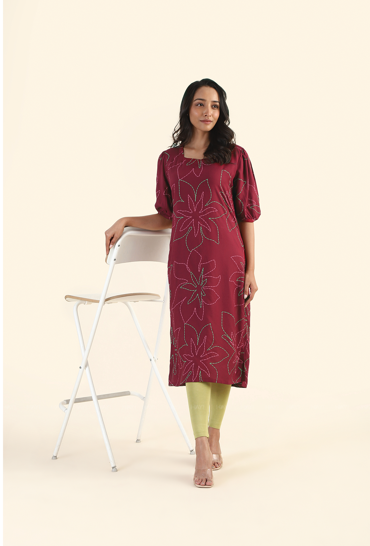Infuse your wardrobe with effortless elegance – this maroon kurti is a celebration of floral artistry and contemporary grace. Perfect for casual chic.