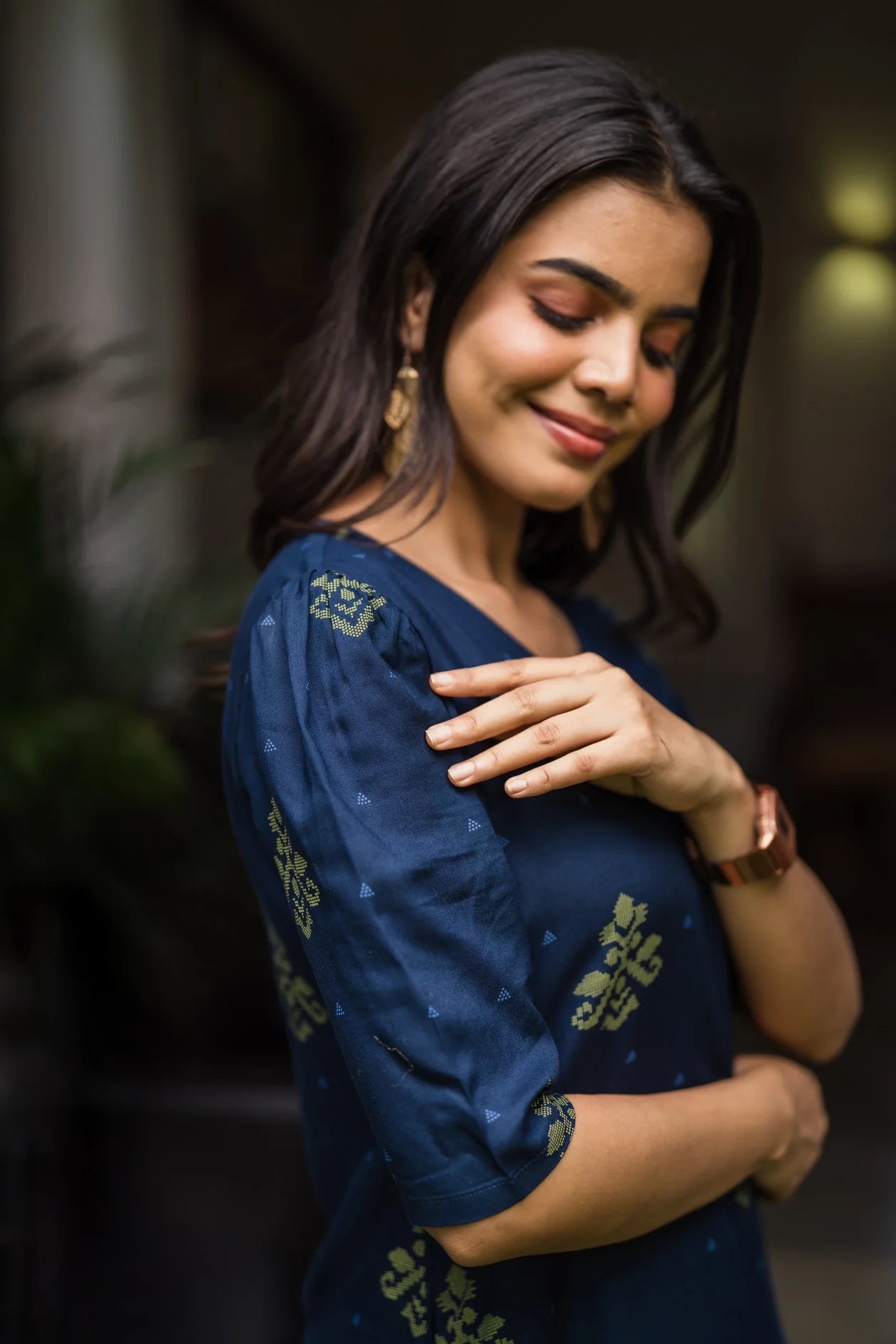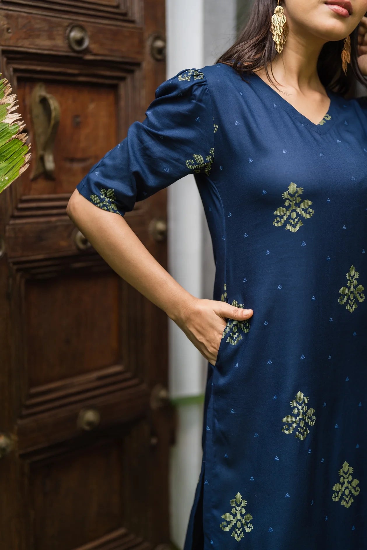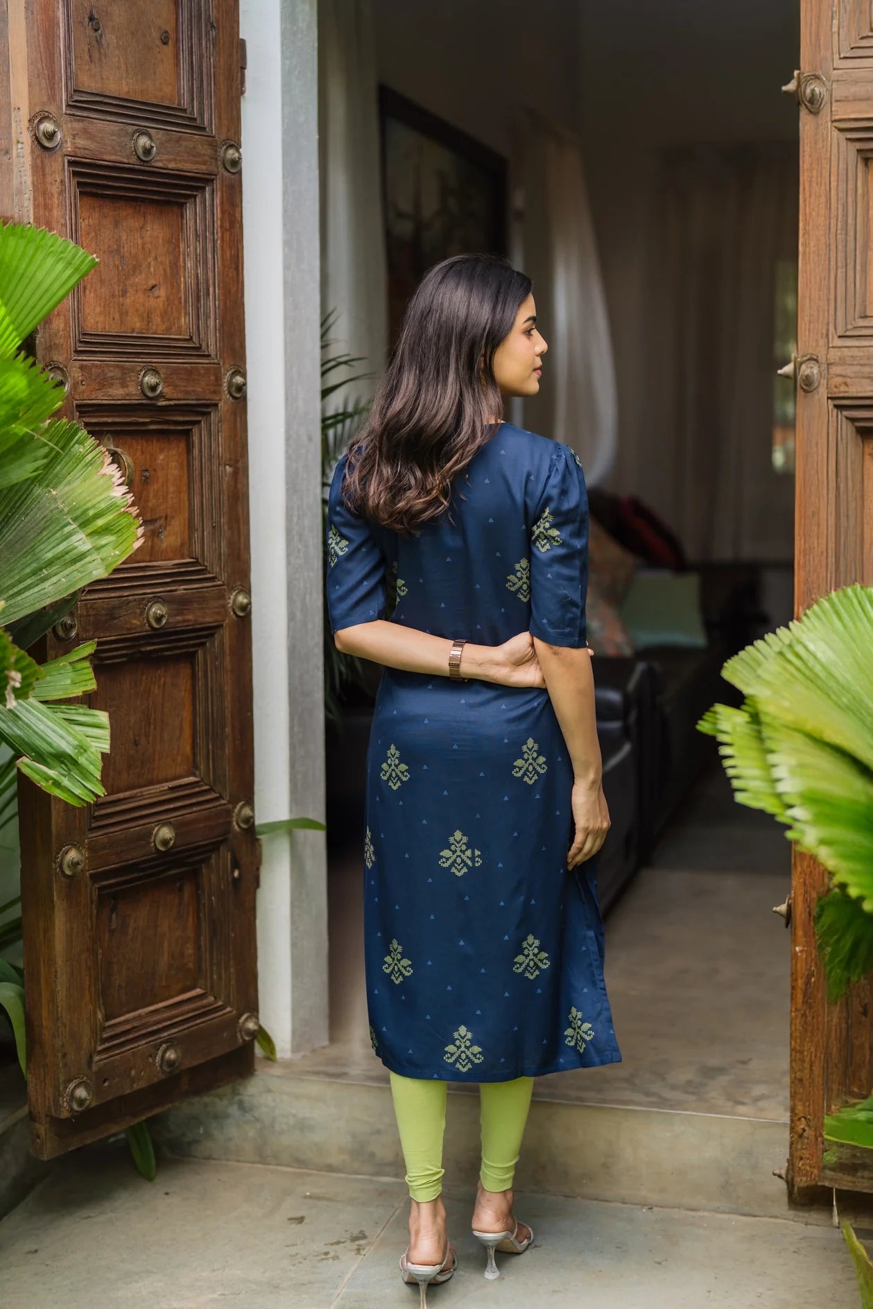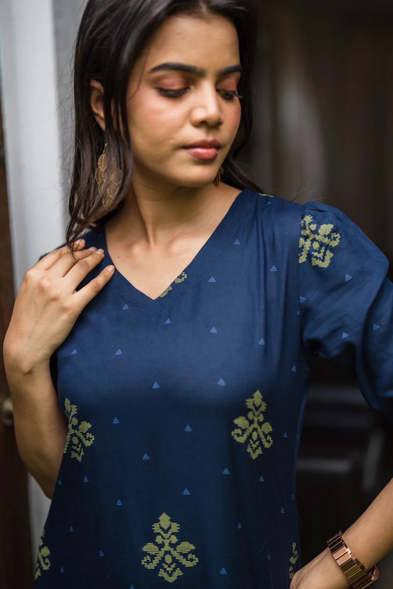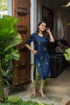 A deep navy kurti with subtle green prints, perfect for a blend of sophistication and comfort.