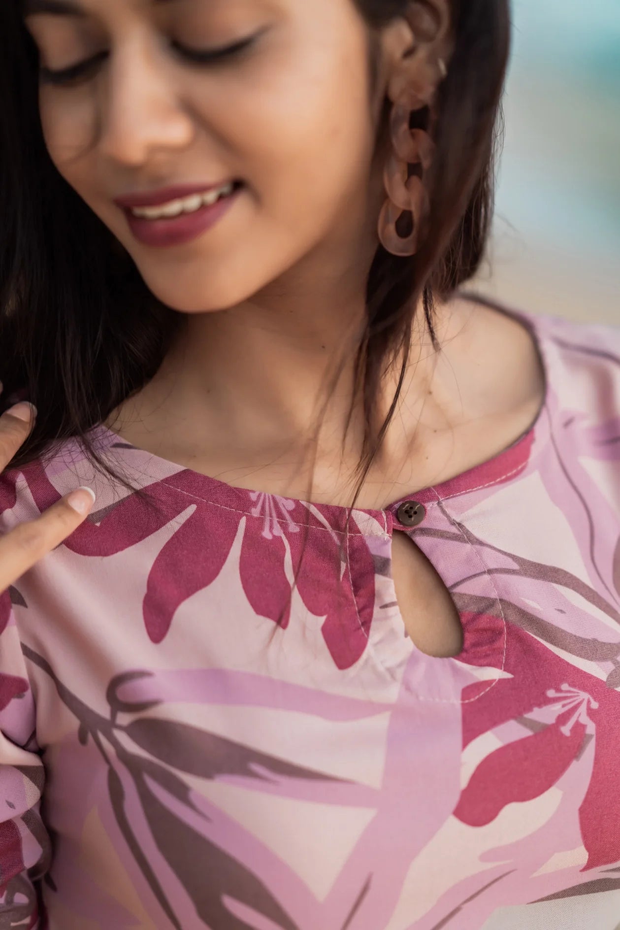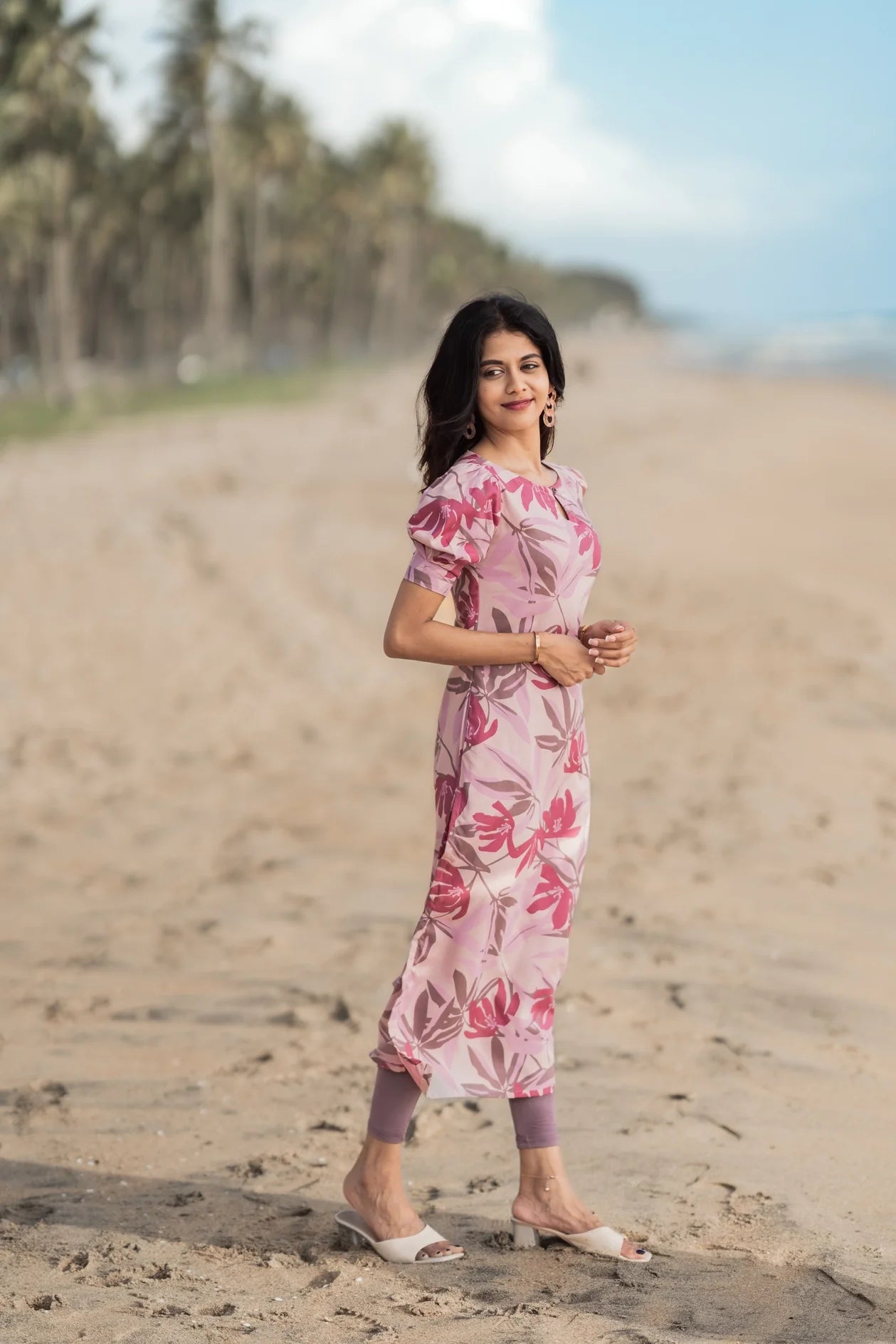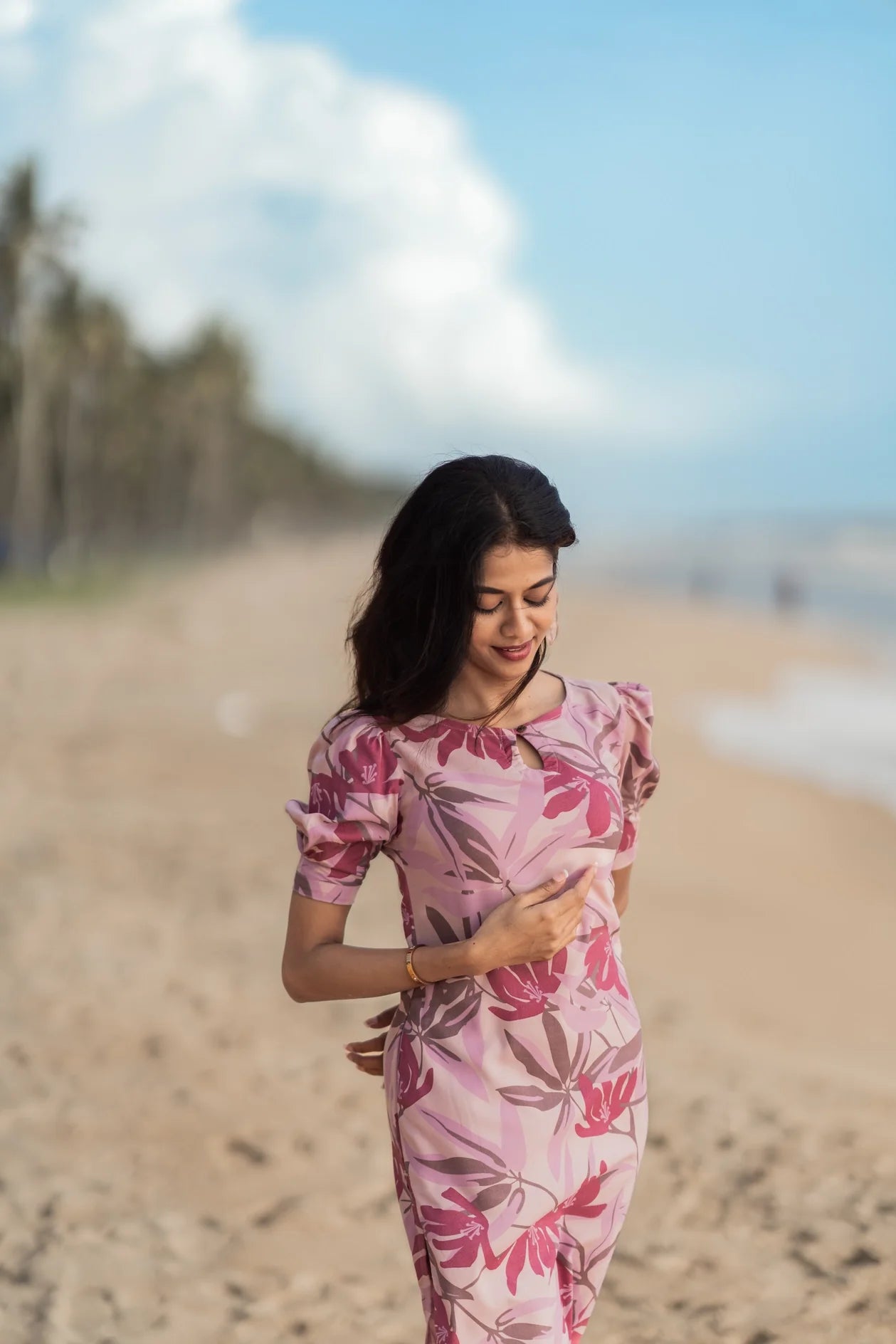 Blush Cascade Pink Linen Blend Dress with Boat neck & Digital Placement Print