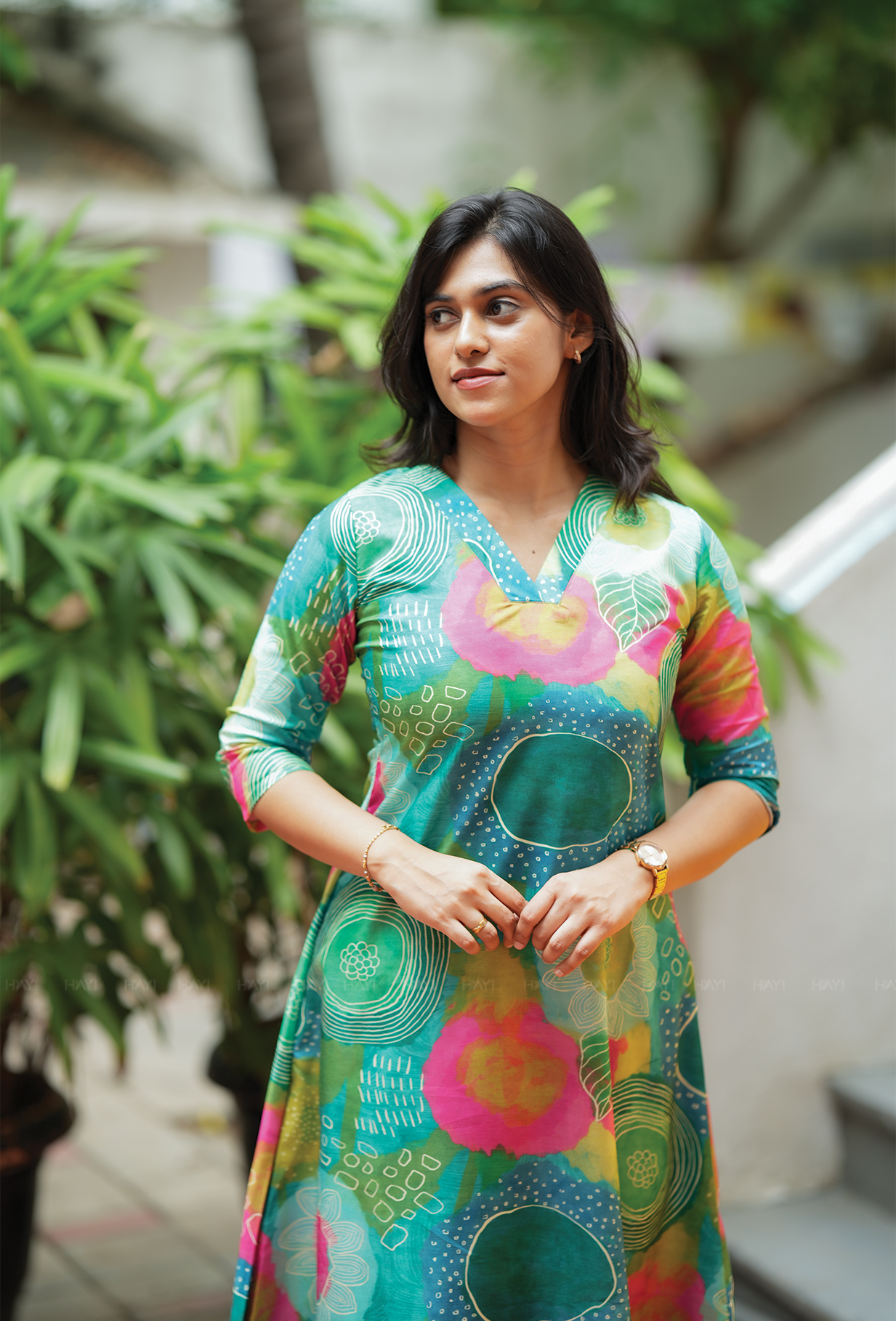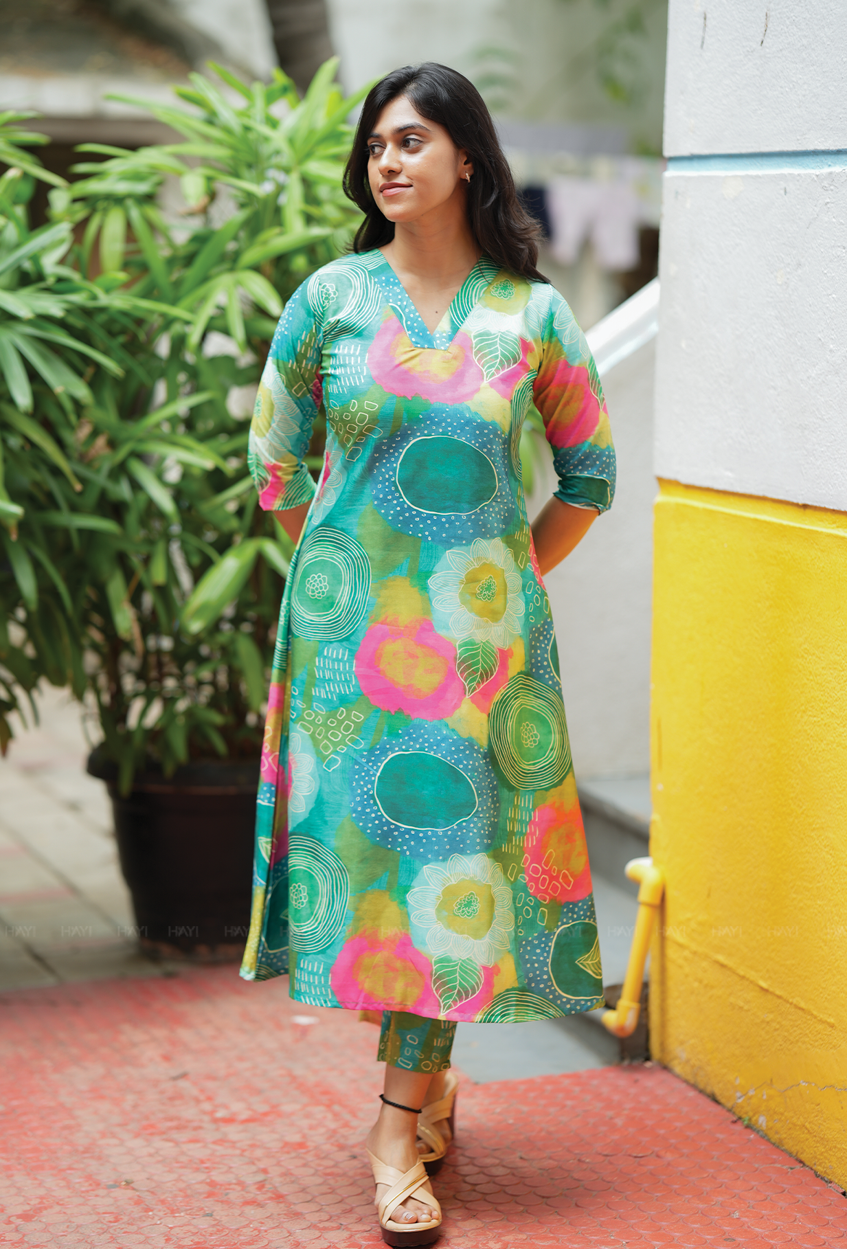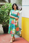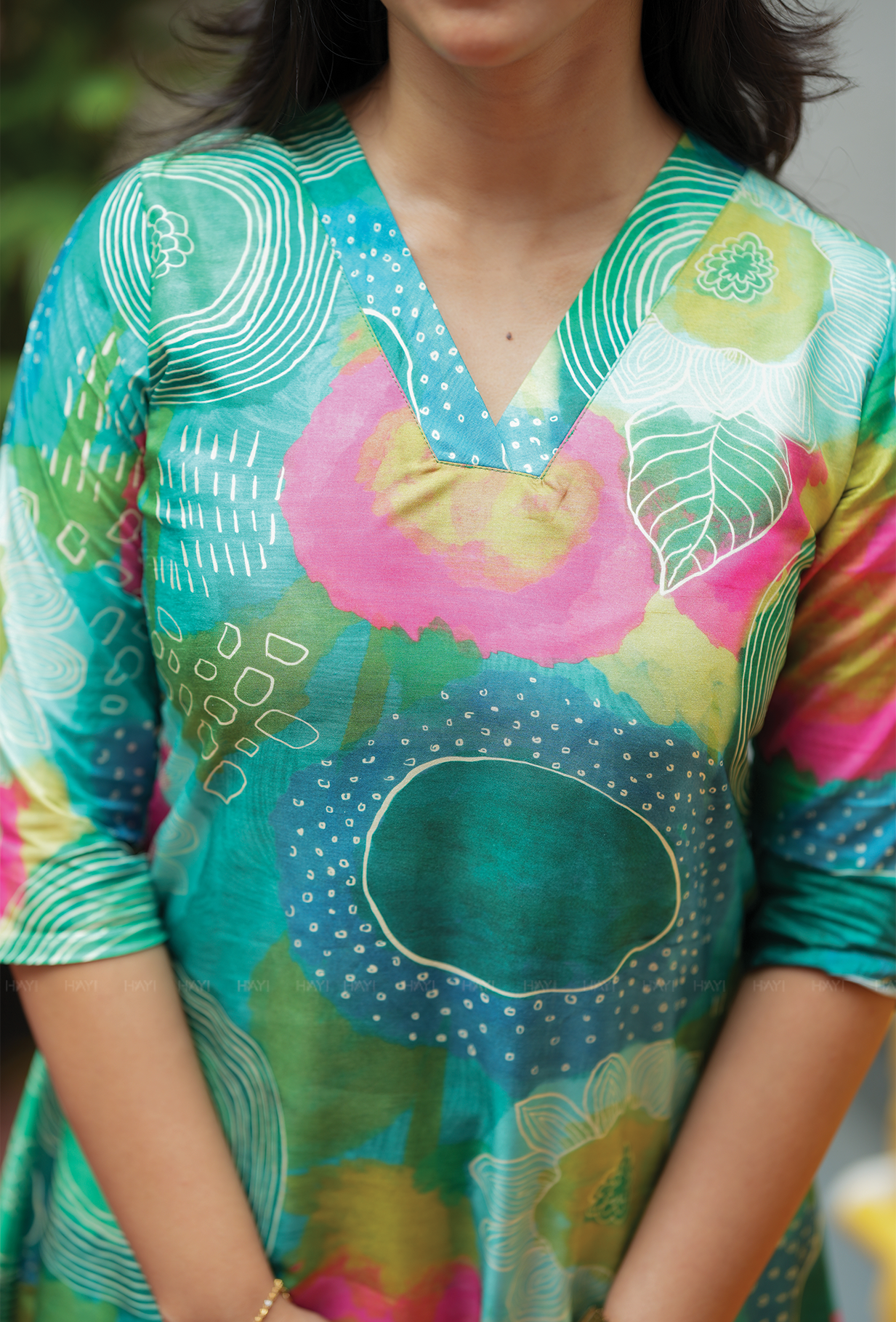 Step into a world of color and comfort with this vibrant Co ord set. The mesh green base blends beautifully with cheerful abstract floral prints, giving you a bold, playful, yet elegant ensemble. Perfect for making a statement in effortless style.