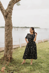 Step into timeless elegance with this regal black maternity maxi dress, beautifully adorned with floral motifs and feminine frill details. Perfect for both special occasions and everyday sophistication.