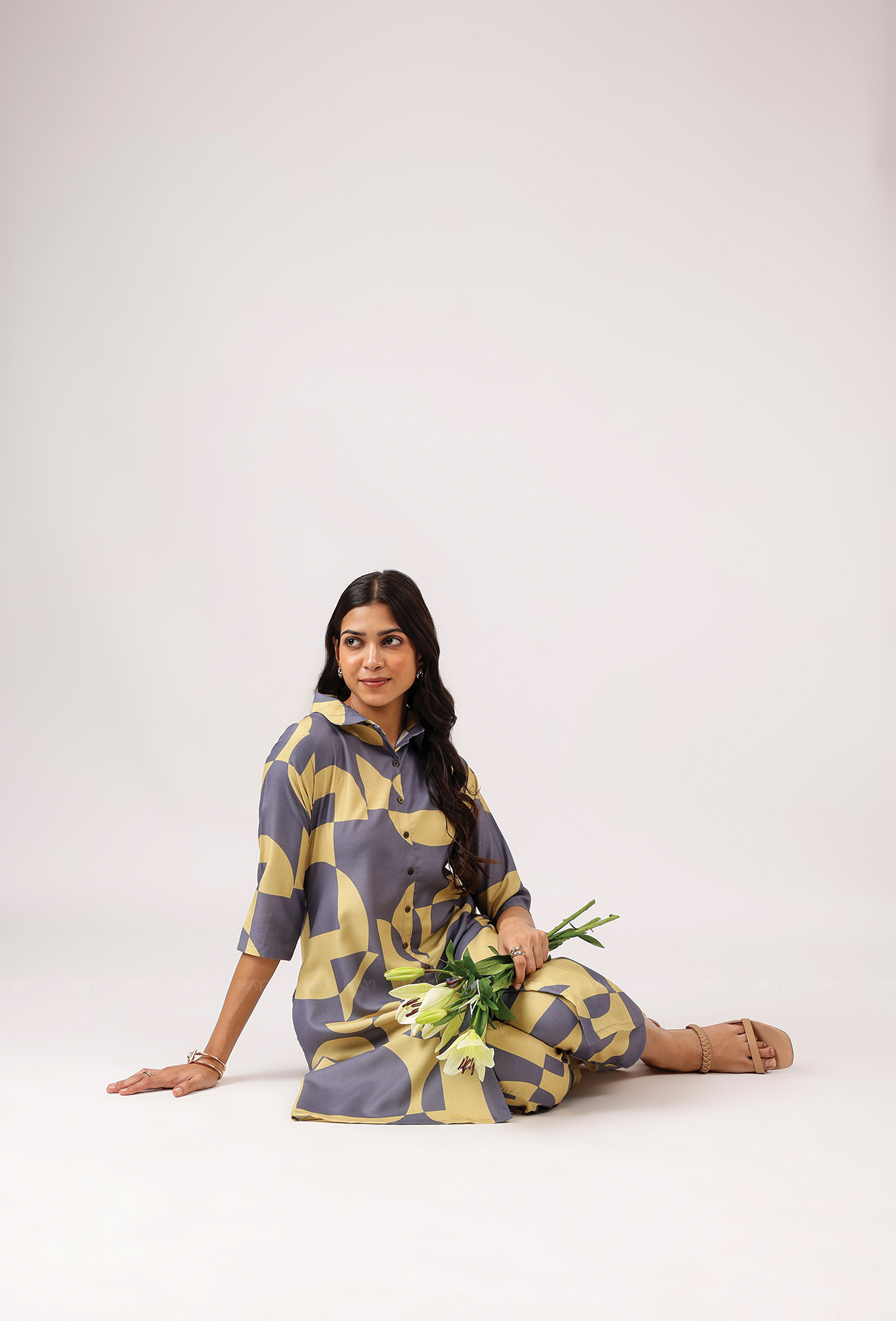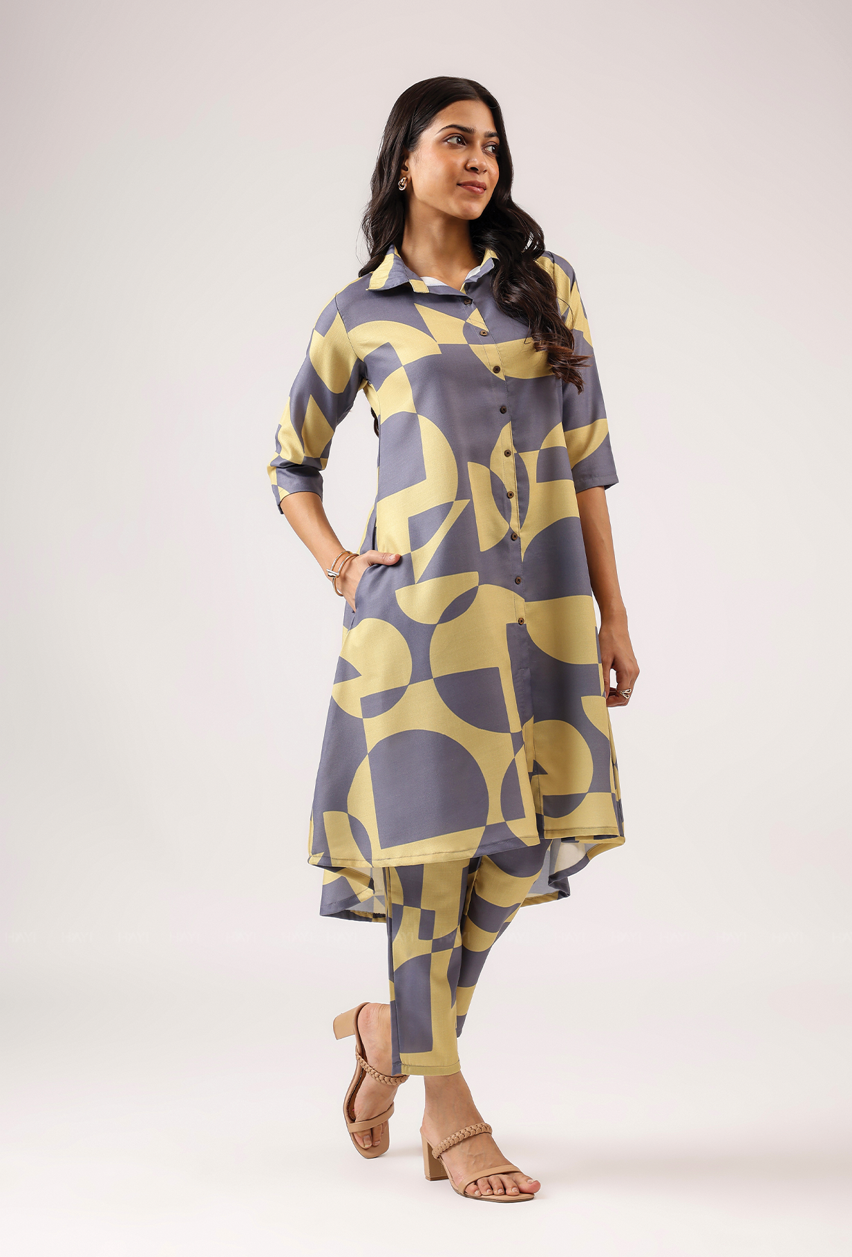 • Bottom Design: Straight-fit ankle-length pants with matching abstract print