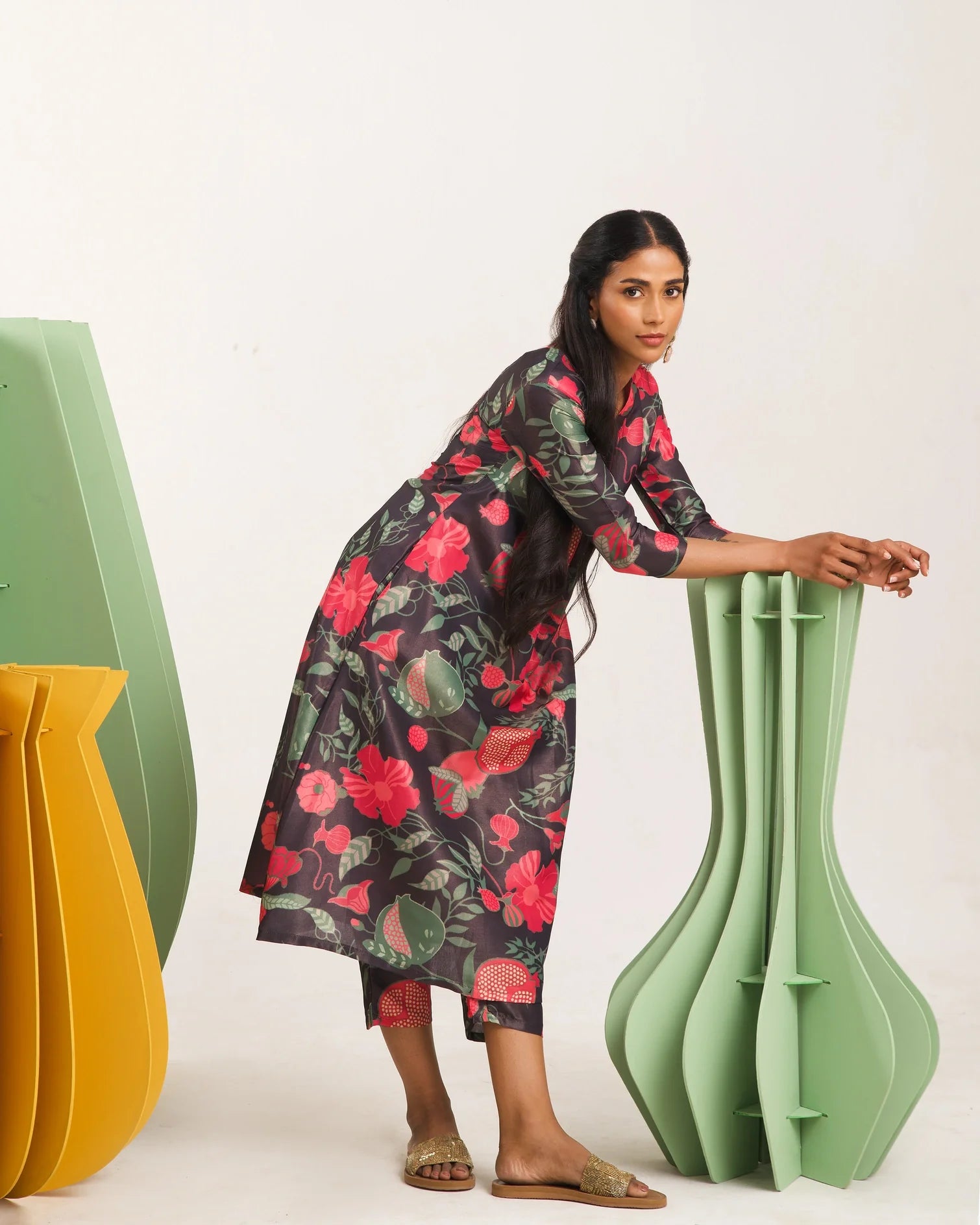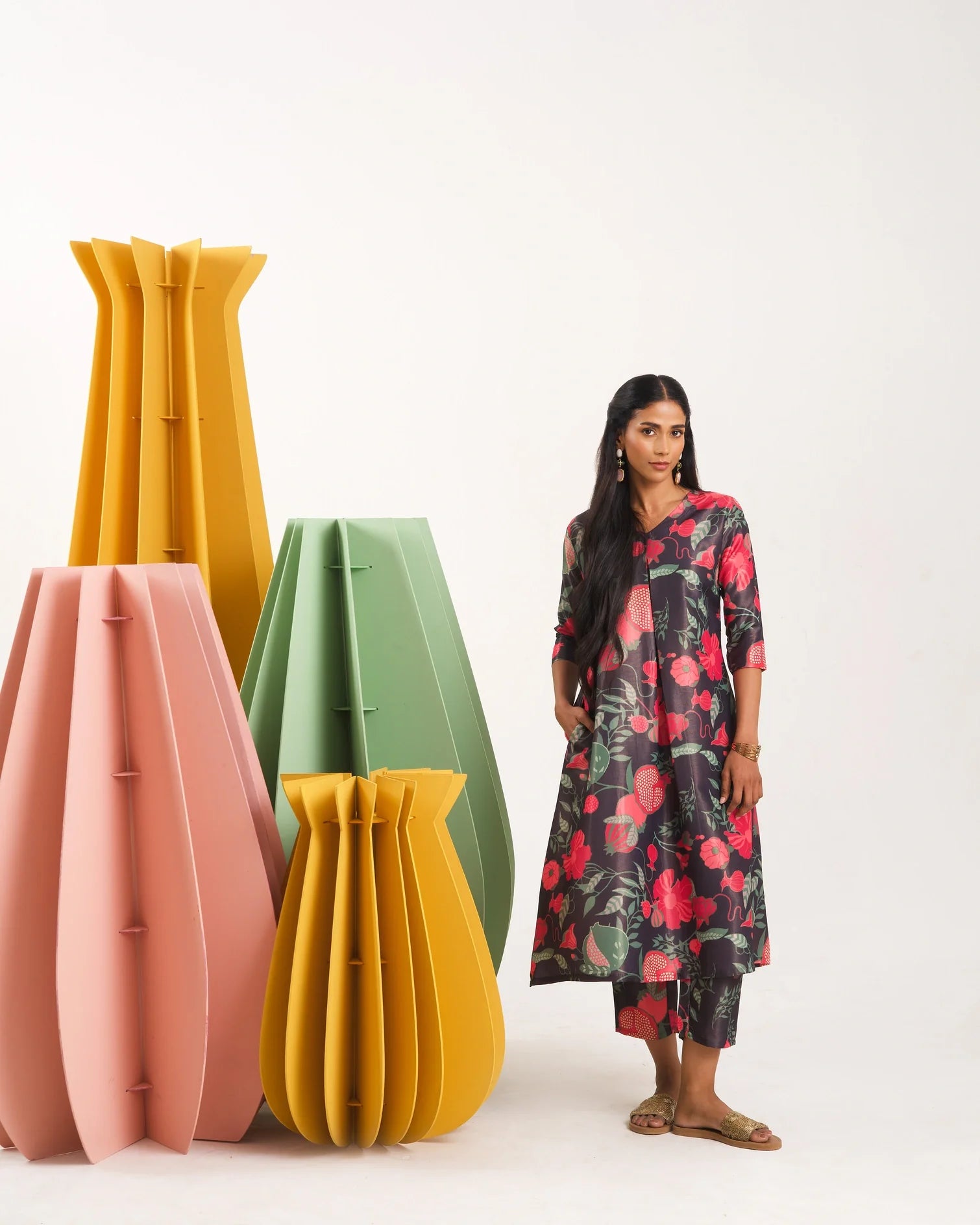 - This set features a deep violet kurta with bold red floral prints, paired with matching pants for a coordinated look.