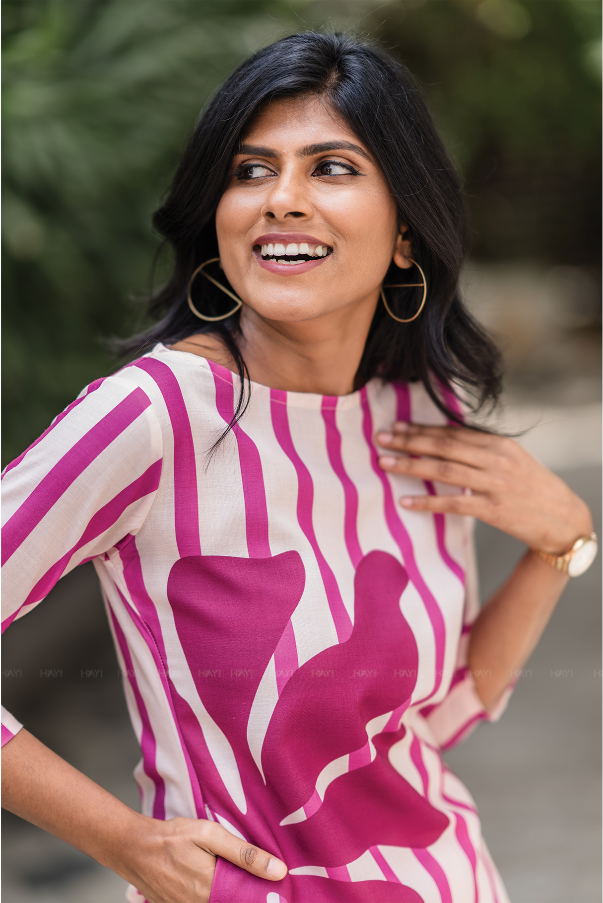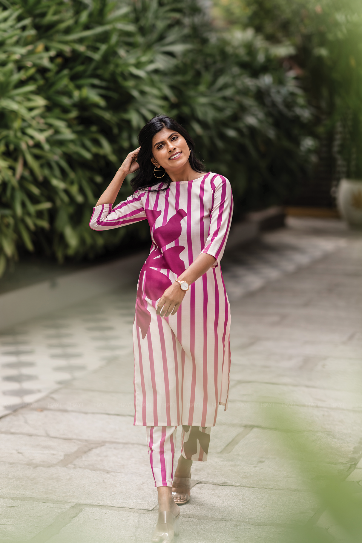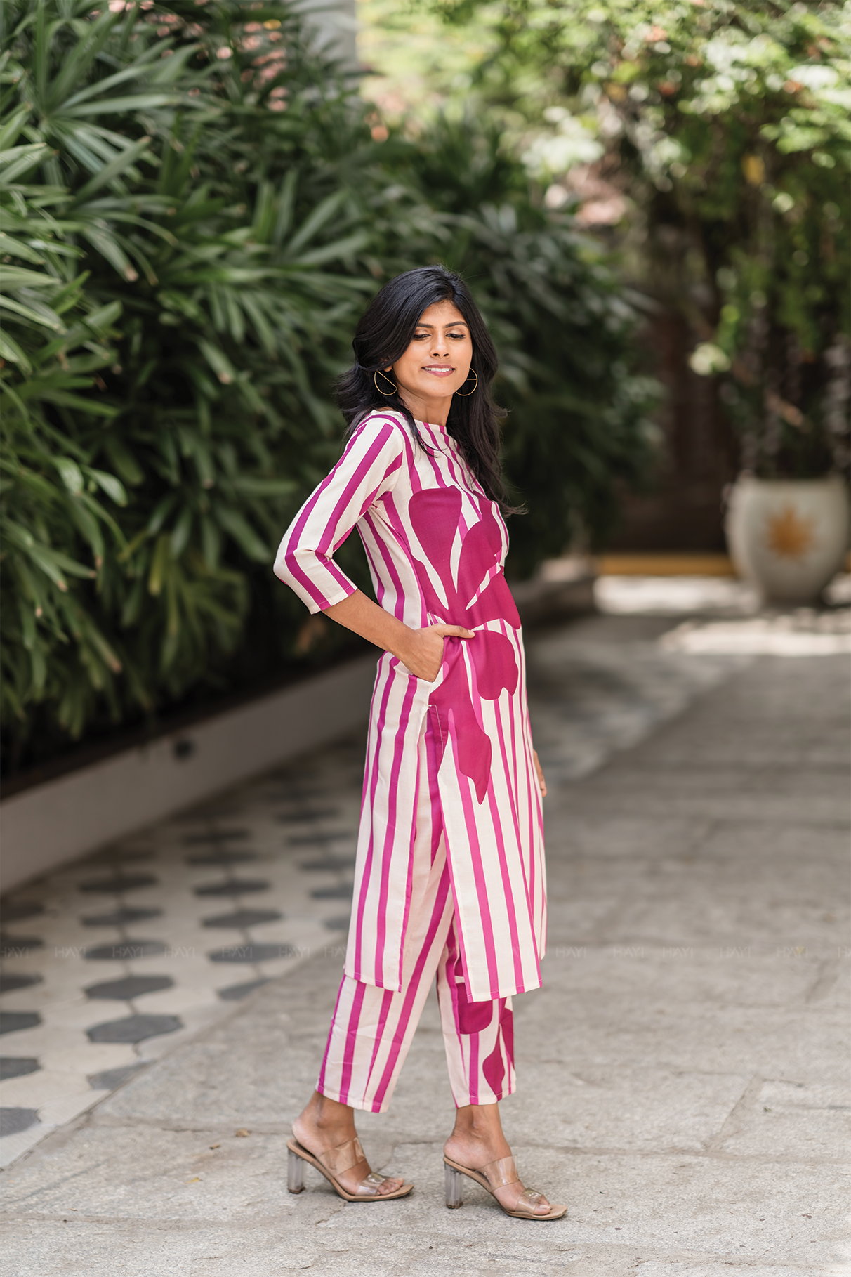 Add a touch of elegance to your everyday look with this peach striped co-ord set, enhanced with bold floral motifs and a graceful boat neckline.