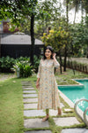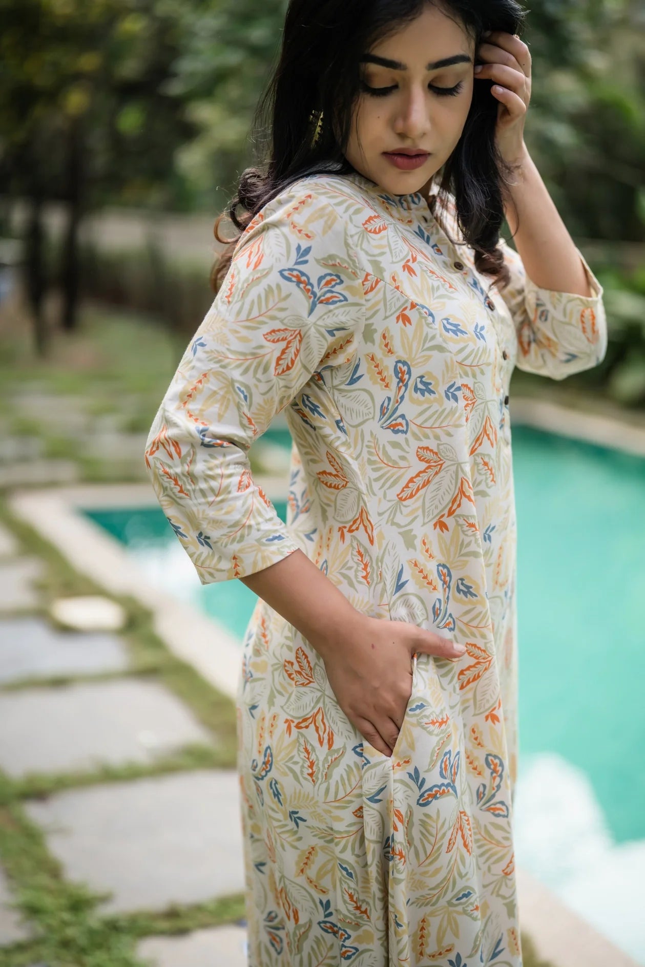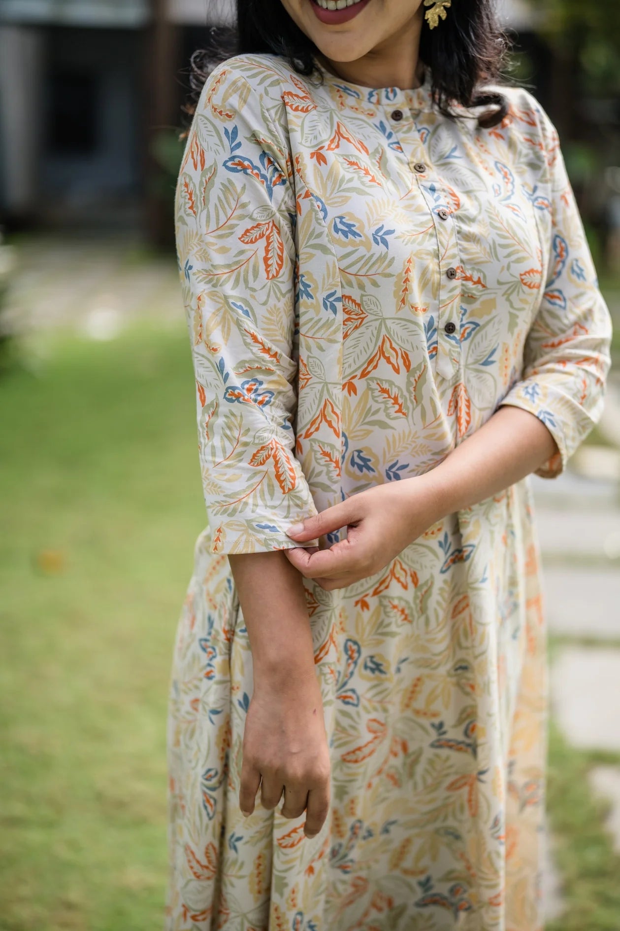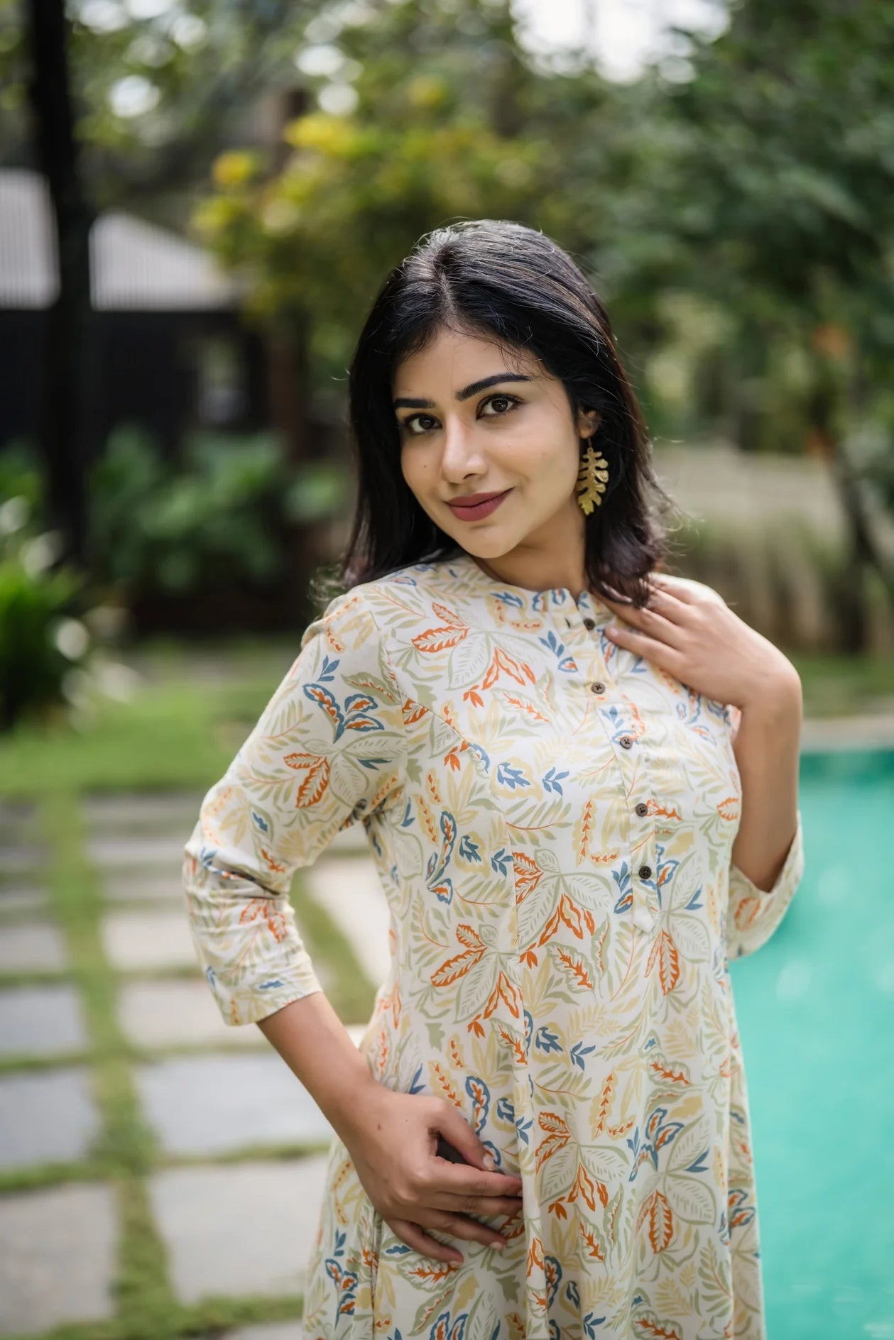 This graceful beige Anarkali-style kurti is adorned with a vibrant leaf and floral print in earthy tones, making it a refreshing choice for casual outings and gatherings. Crafted from soft, breathable fabric, this kurti provides a comfortable fit with a flowy silhouette that enhances its charm. The mandarin collar and buttoned front detail add an element of sophistication, while the three-quarter sleeves and flared cut provide a relaxed and stylish look. The midi length is ideal for pairing with leggings, creating a balanced and elegant outfit.