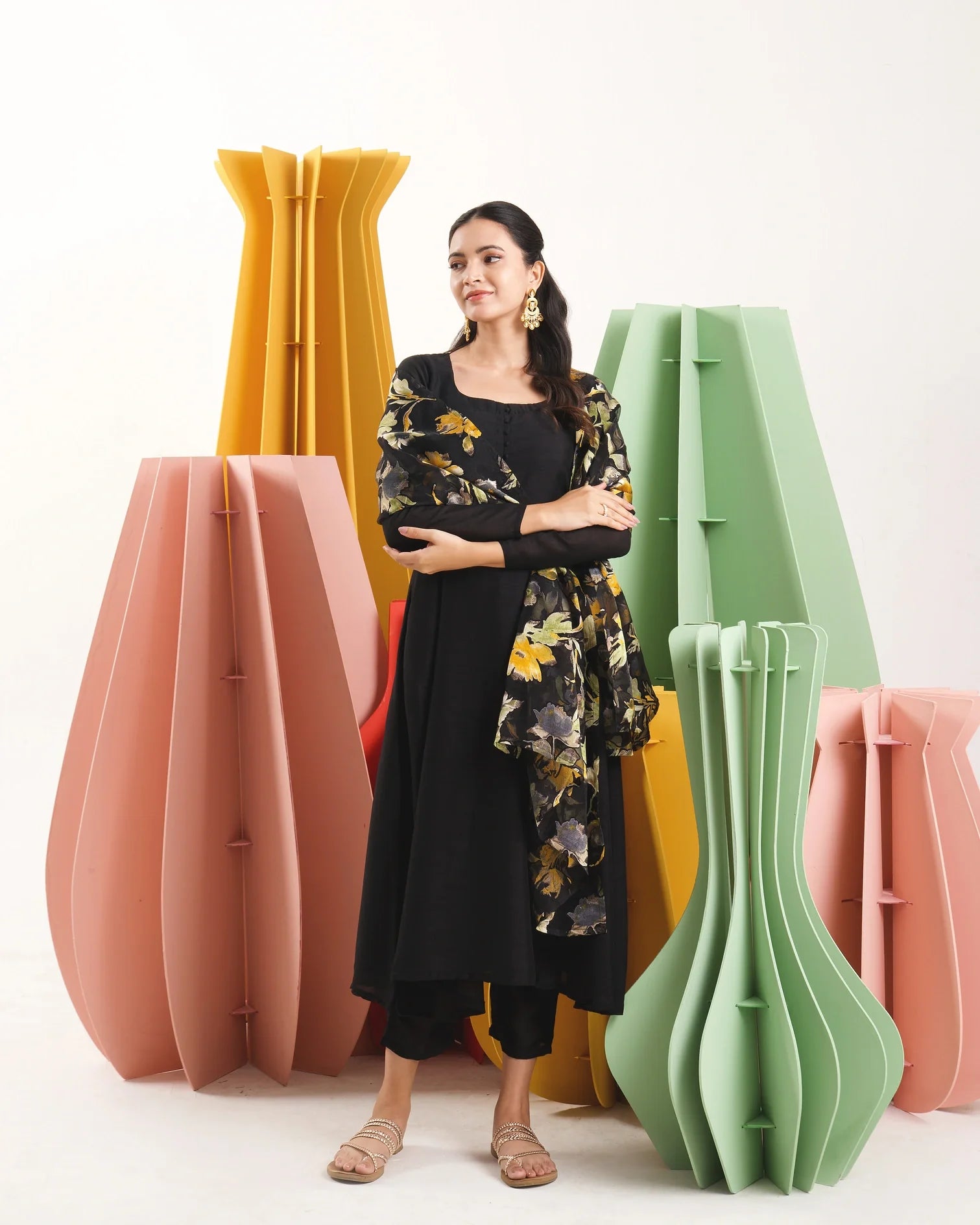 • This set features a classic black kurta, paired with matching pants, and a yellow floral burnt organza dupatta, adding a striking contrast and sophistication to the look.