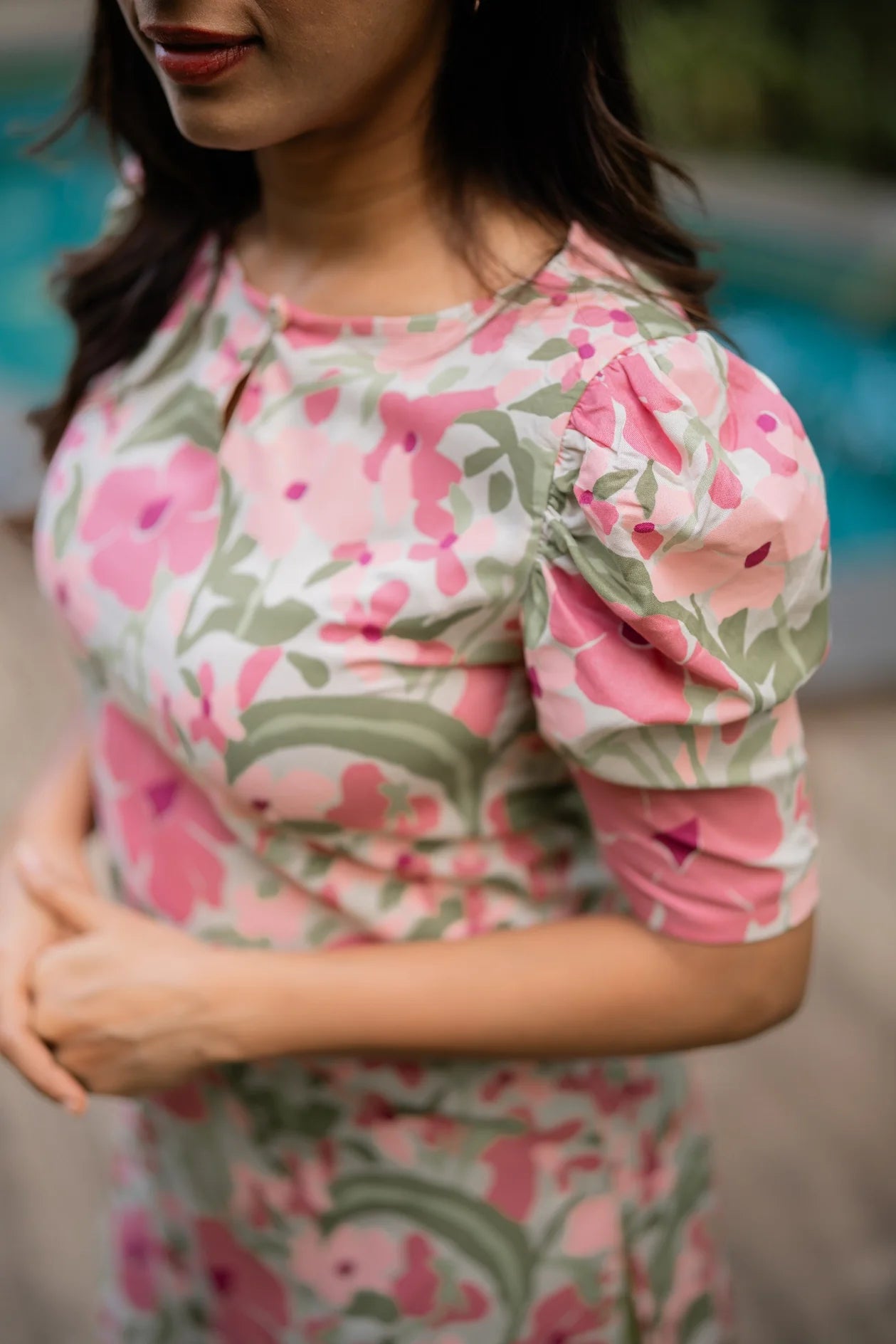 This stunning pink floral dress exudes a blend of feminine charm and vintage-inspired elegance, perfect for both casual and semi-formal occasions. The dress features a delicate floral print in shades of pink and green on a soft pink base, creating a lively and refreshing look. Designed with a flattering straight cut and puffed half sleeves, it offers a modern twist on a classic silhouette. The gathered detailing on the sleeves adds a touch of sophistication, while the round neckline keeps it simple yet stylish.