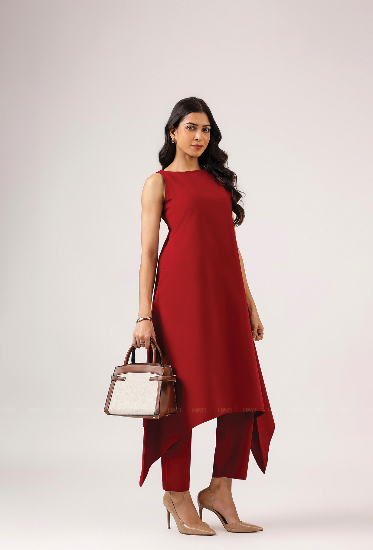 Striking and structured – this bold maroon co-ords set blends contemporary cuts with effortless elegance, featuring a sharp asymmetrical hem and clean lines that command attention.