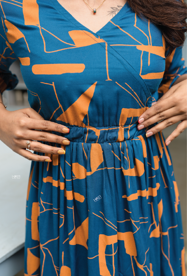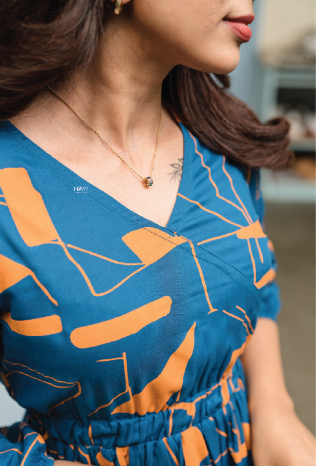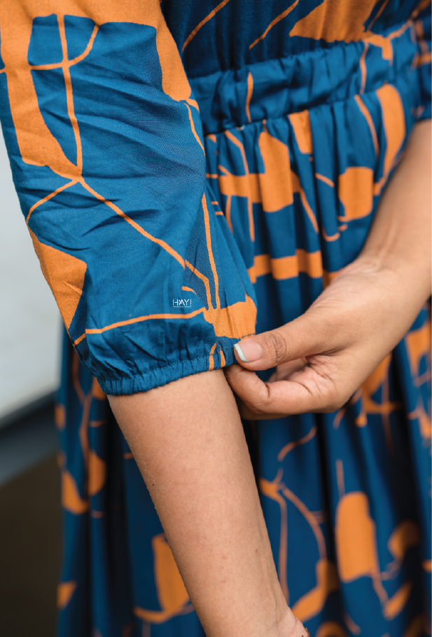- Color: Blue with mustard abstract print