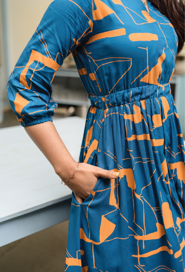 This elegant blue maxi dress features a bold abstract print in contrasting mustard tones. Its flowy silhouette and elasticated waist offer comfort and style, making it perfect for casual outings or gatherings.