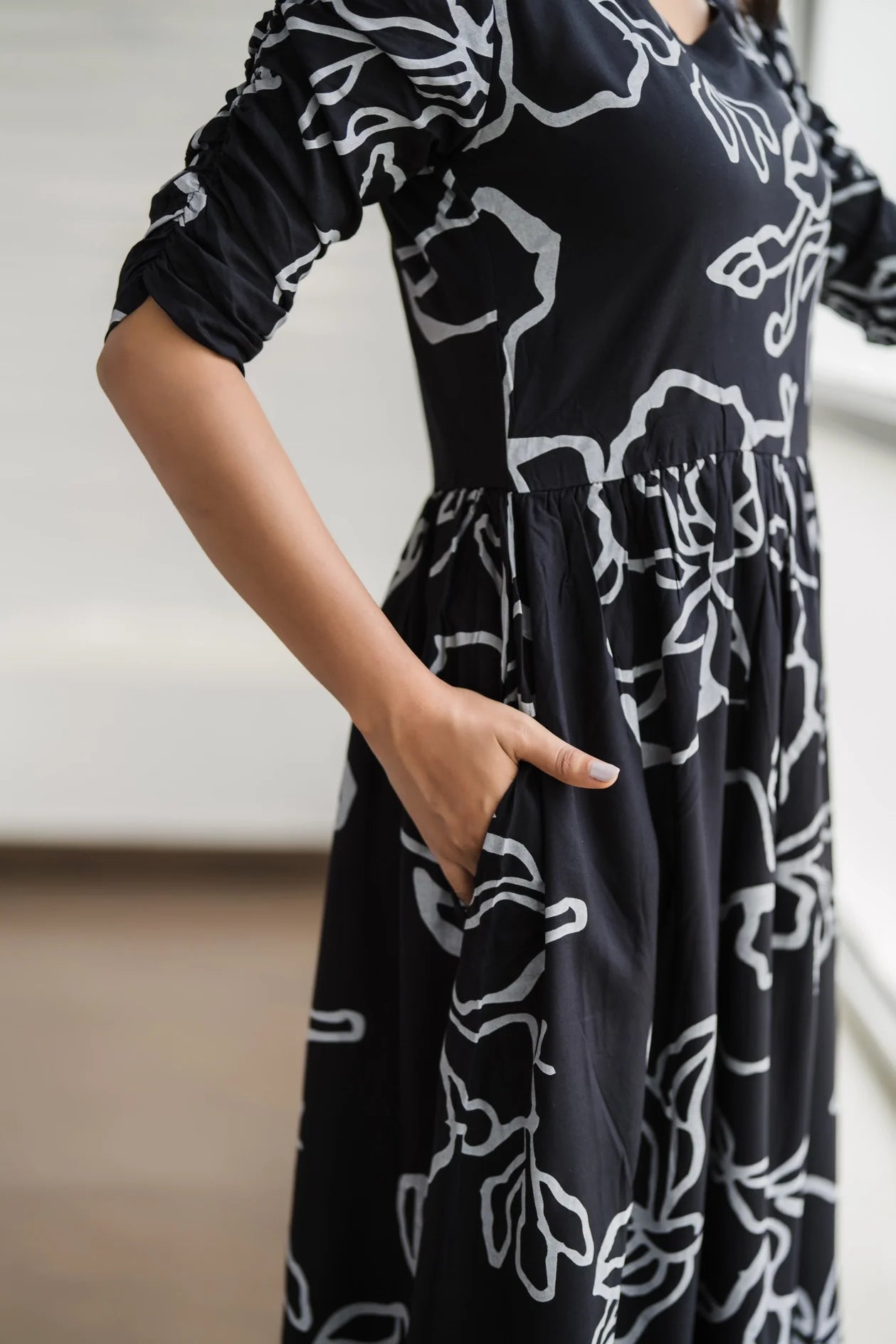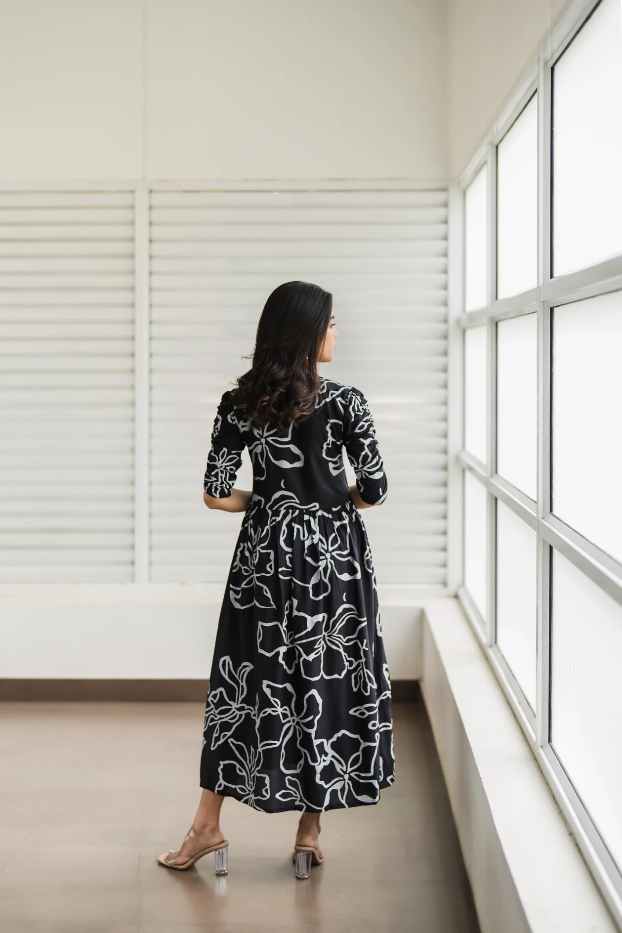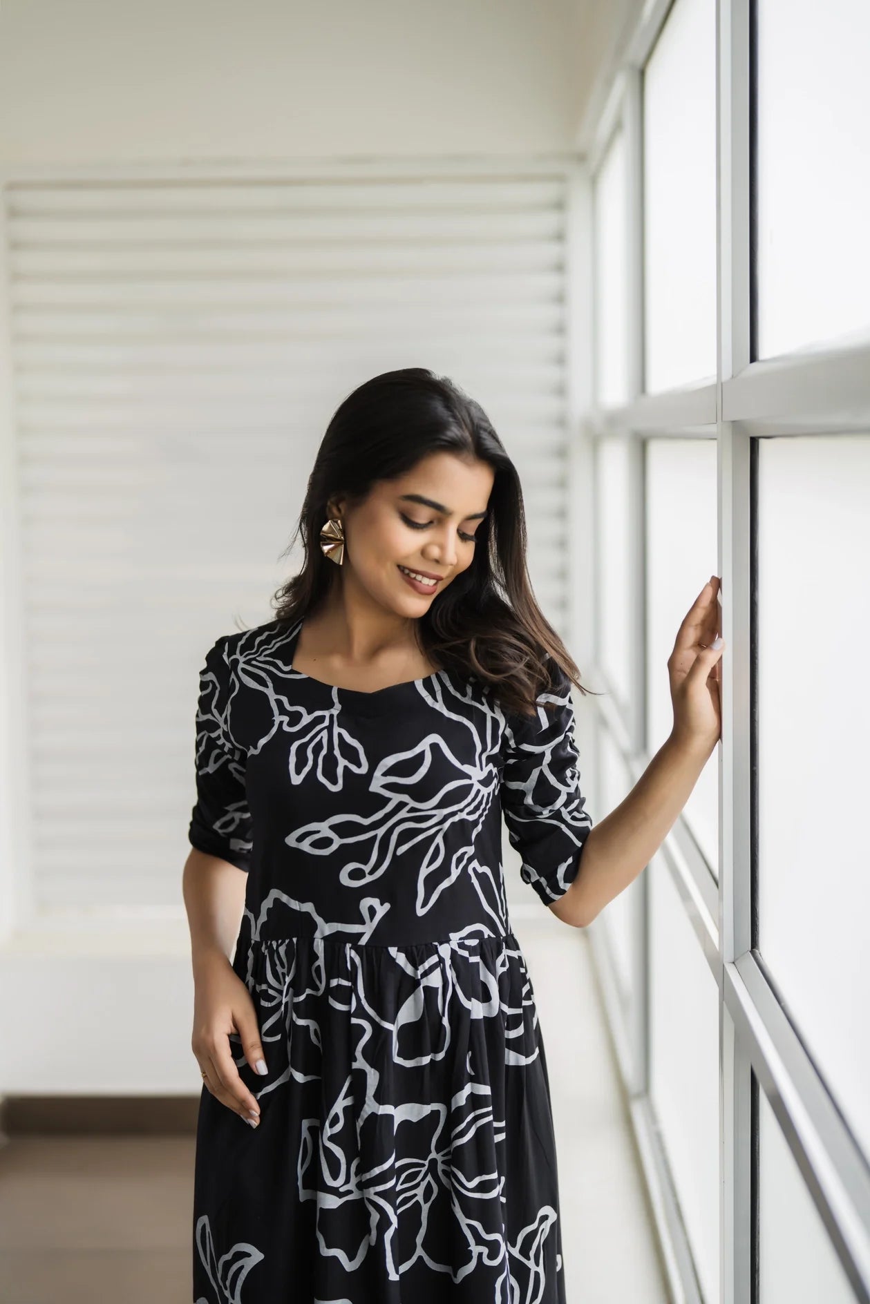 Bright and stylish, this flowy dress combines comfort and elegance with a touch of modern design. The dress is crafted from Viscose lightweight fabric, perfect for all-day wear, with an eye-catching abstract line pattern in white over a deep black base, creating a chic, high-contrast look. Styled with Sweet Heart neckline and three-quarter length sleeves, this dress is easy to accessorize and pairs well with both heels and flats.