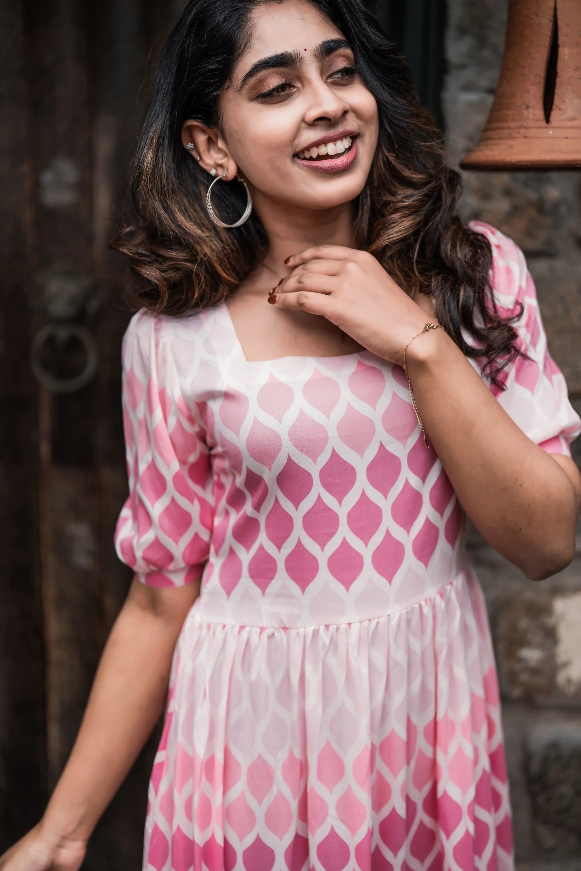 Celestia Dots Pink Handloom Cotton Co-ord with V-Neckline & Puff Elbow Sleeves